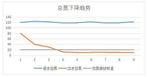 采用邁葳生化修復(fù)方案后,出水總氮由80mg/L持續(xù)下降,最終穩(wěn)定出水TN在10mg/L左右,達(dá)到一級B排放標(biāo)準(zhǔn)。