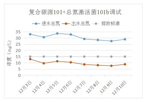 技術(shù)方案:在不改變水站原有設(shè)施的條件下,采用生化系統(tǒng)菌群優(yōu)化及針對(duì)性營(yíng)養(yǎng)素組合的方案,使用我司復(fù)合碳源101b與總氮激活菌101,將系統(tǒng)出水總氮穩(wěn)定降至15 mg/L以下。